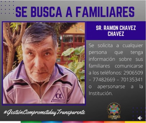 SE BUSCA A FAMILIARES DEL ADULTO MAYOR, Sr. Ramon Chavez Chavez de 60 años de edad, ingreso al “Centro Rosaura Campos” ubicado en la calle Yanacocha, casi esquina Sucre, frente a...