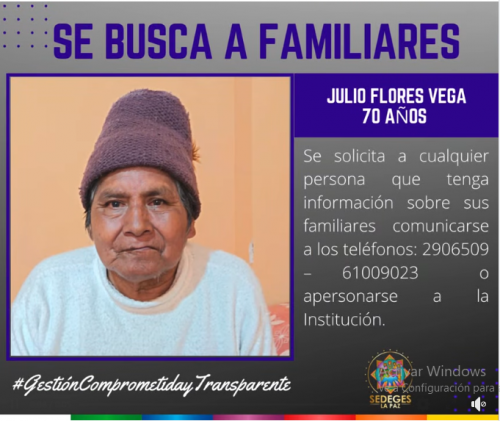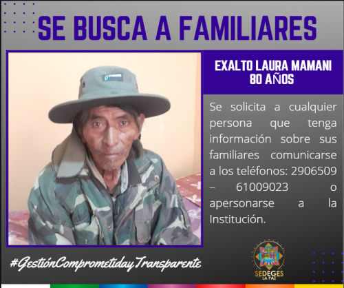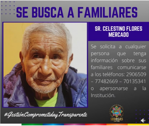 SE BUSCA A FAMILIARES DEL ADULTO MAYOR, Sr. MARCELINO MAMANI CHOQUETIJLLA de 83 años, ingreso al “Centro Rosaura Campos” ubicado en la calle Yanacocha, casi esquina Sucre, frente a...