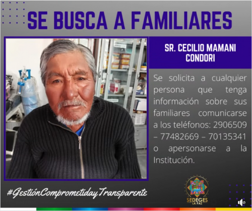 SE BUSCA A FAMILIARES DEL ADULTO MAYOR, Sr. CECILIO MAMANI CONDORI de 71 años, ingreso al “Centro Rosaura Campos” ubicado en la calle Yanacocha, casi esquina Sucre, frente a Ex. Derechos...