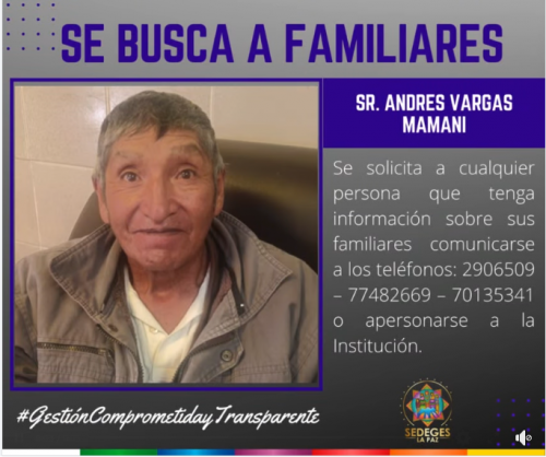 SE BUSCA A FAMILIARES DEL ADULTO MAYOR, Sr. ANDRES VARGAS MAMANI de 63 años, ingreso al “Centro Rosaura Campos” ubicado en la calle Yanacocha, casi esquina Sucre, frente a Ex. Derechos...