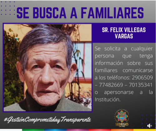 SE BUSCA A FAMILIARES DEL ADULTO MAYOR, Sr. FELIX VILLEGAS VARGASA de 74 años, ingreso al “Centro Rosaura Campos” ubicado en la calle Yanacocha, casi esquina Sucre, frente a Ex. Derechos...