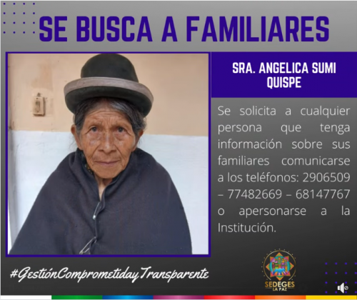 SE BUSCA A FAMILIARES DEL ADULTO MAYOR, ANGELICA SUMI QUISPE de 80 años, ingreso al “Centro Rosaura Campos” ubicado en la calle Yanacocha, casi esquina Sucre, frente a Ex. Derechos...