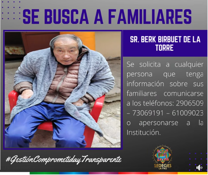 Se busca a familiares del adulto mayor, BERK BIRBUET DE LA TORRE de 72 años, ingreso al “Centro Rosaura Campos” ubicado en la calle Yanacocha N° 752 Entre calles Sucre e Indaburo Zona Centro, frente a ex Derechos Reales de la Ciudad de la Paz, en fecha 4 de marzo de 2026 por la problemática de ABANDONO remitido por personal de la POLICIA NACIONAL, de la ciudad de La Paz.