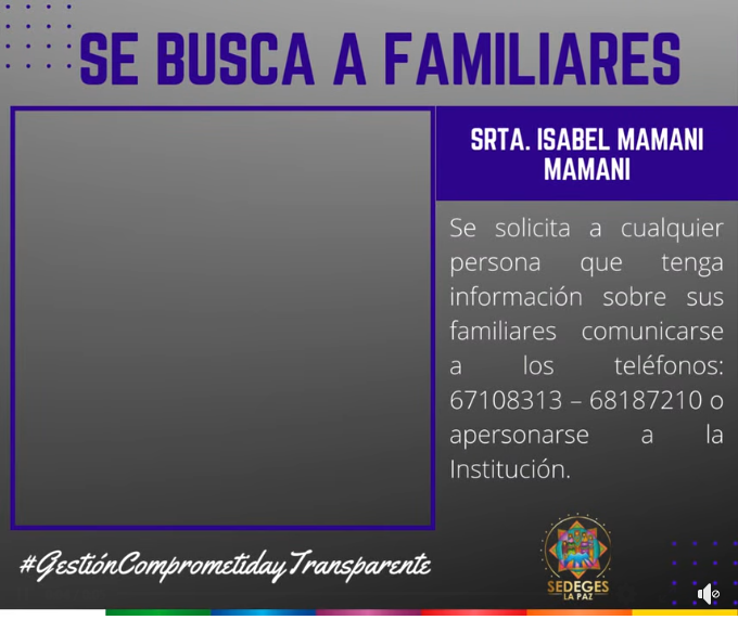 SE BUSCA A FAMILIARES de la adolescente de nombre ISABEL MAMANI MAMANI con C.I. 10010844 qr de 17 años de edad, quien se encuentra con acogimiento circunstancial en la Fundación Munasim Kullakita de la Ciudad de El Alto, quien fuera el señor PEDRO MAMA NI (PROGENITOR) falleció en la gestión 2015 y de NICOLASA MAMANI (PROGENITORA) se desconoce su paradero y hasta la fecha ningun familiar se hacer cargo menos se conoce de otros familiares.